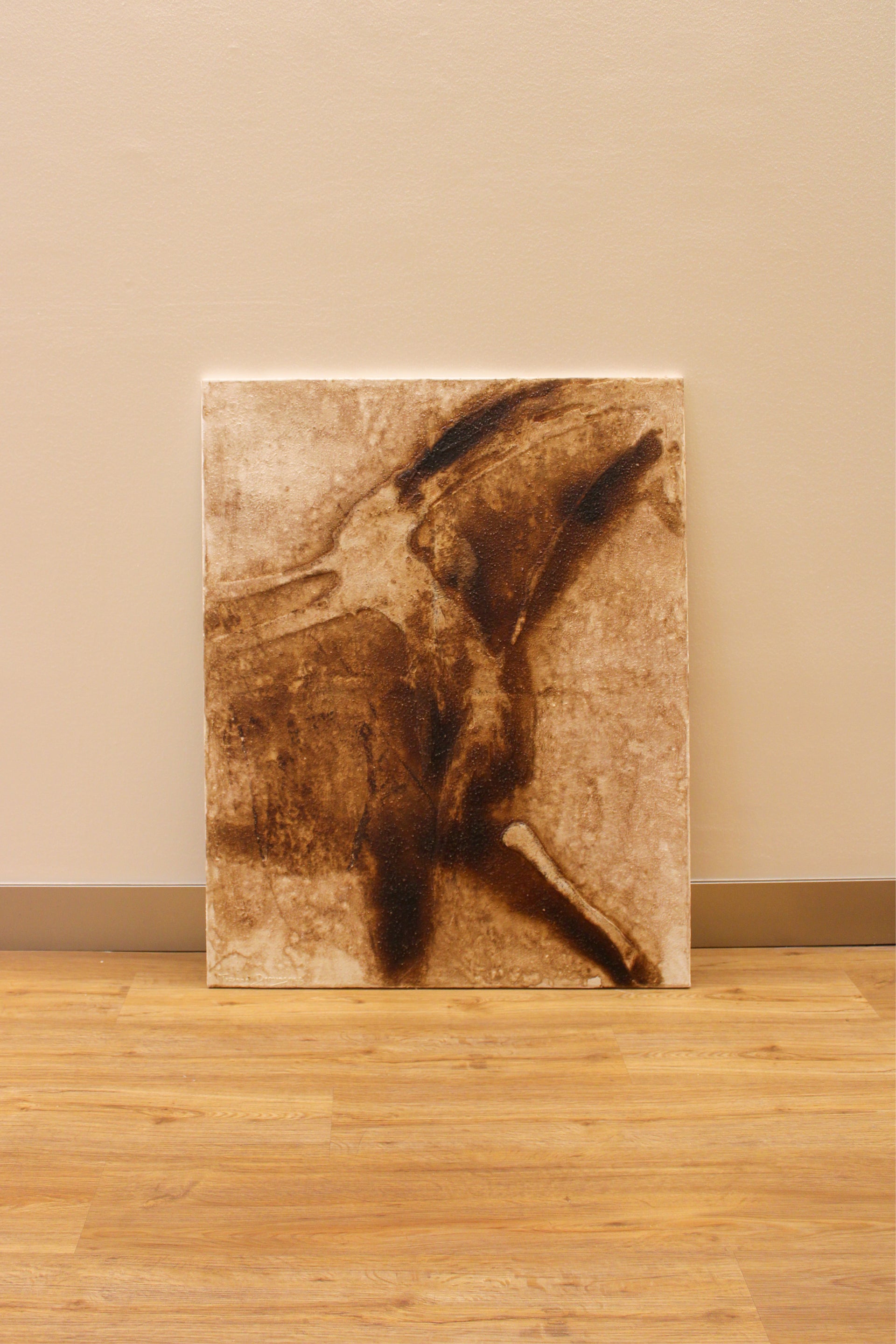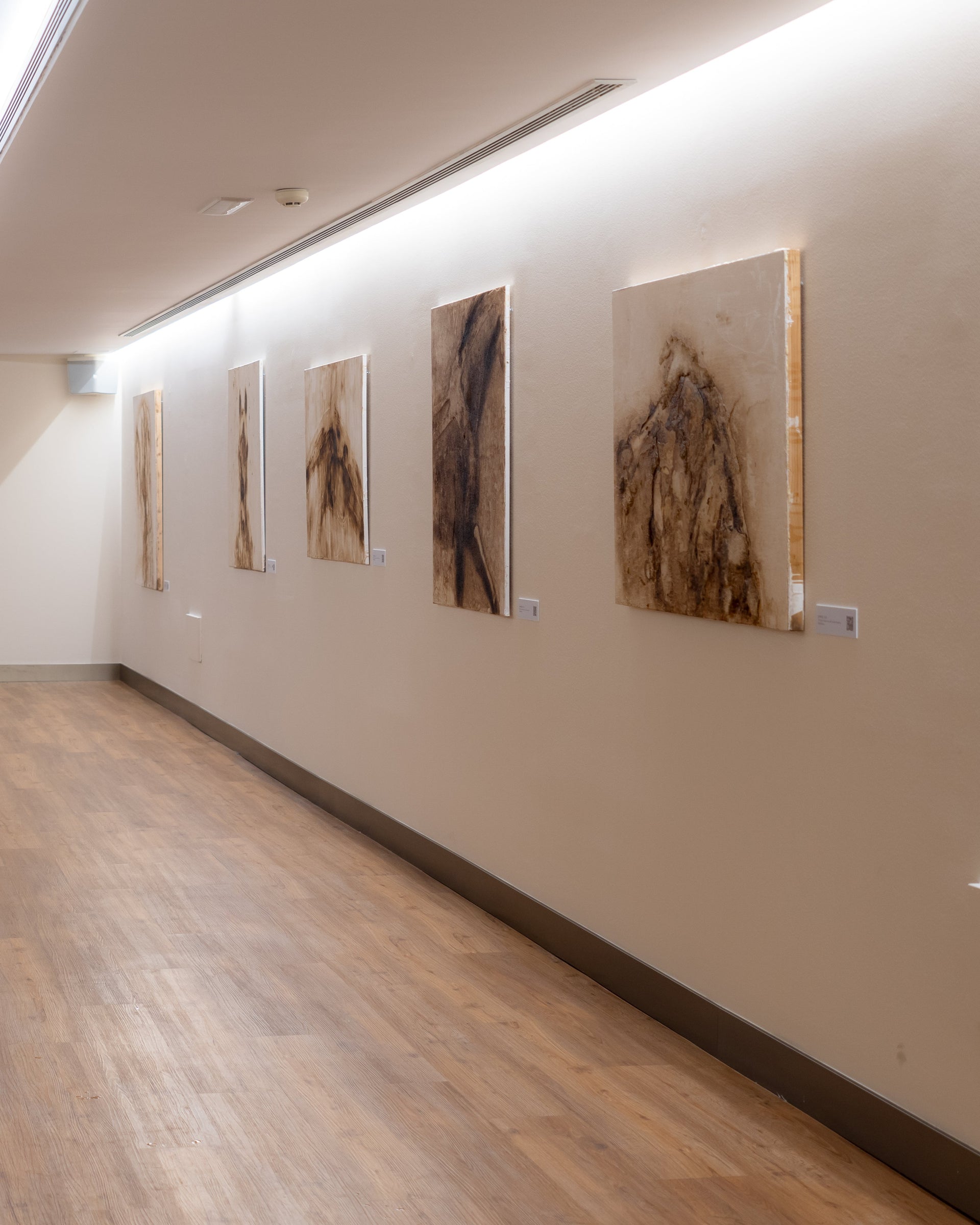 The exhibition featured a series of paintings created with coffee, charcoal, and natural pigments—materials chosen for their organic tactility and emotional weight. Each canvas captured a moment of stillness or movement, inviting viewers to pause and reflect on themes of vulnerability, freedom, and the invisible force that animates life itself. The word ánima, meaning “soul” in Spanish, served as both title and guiding thread.