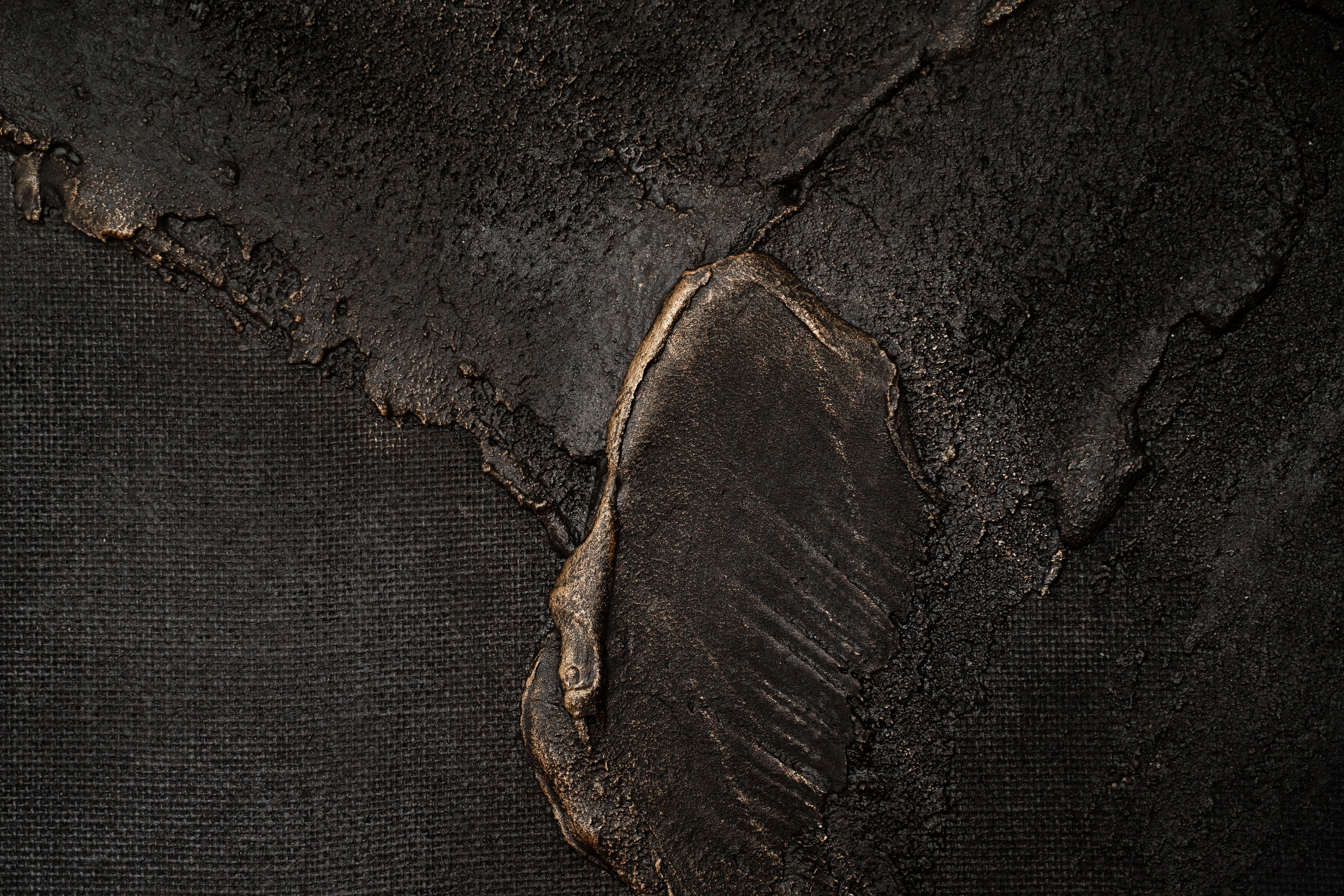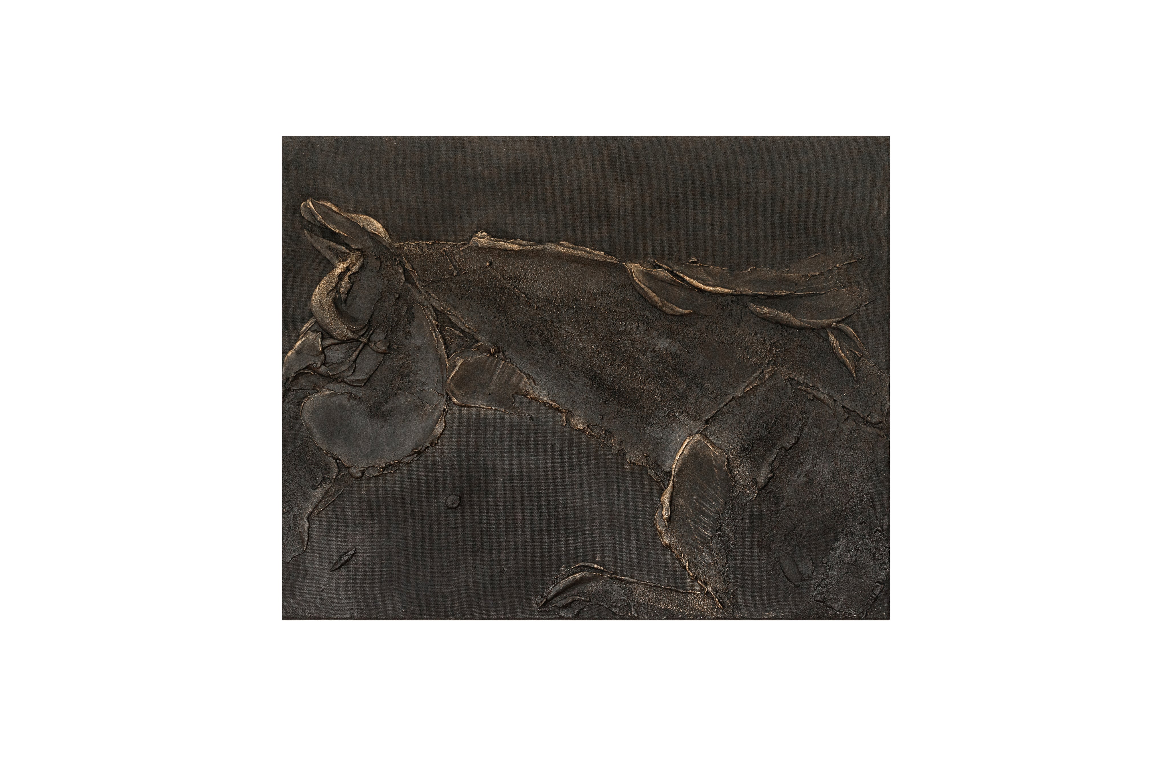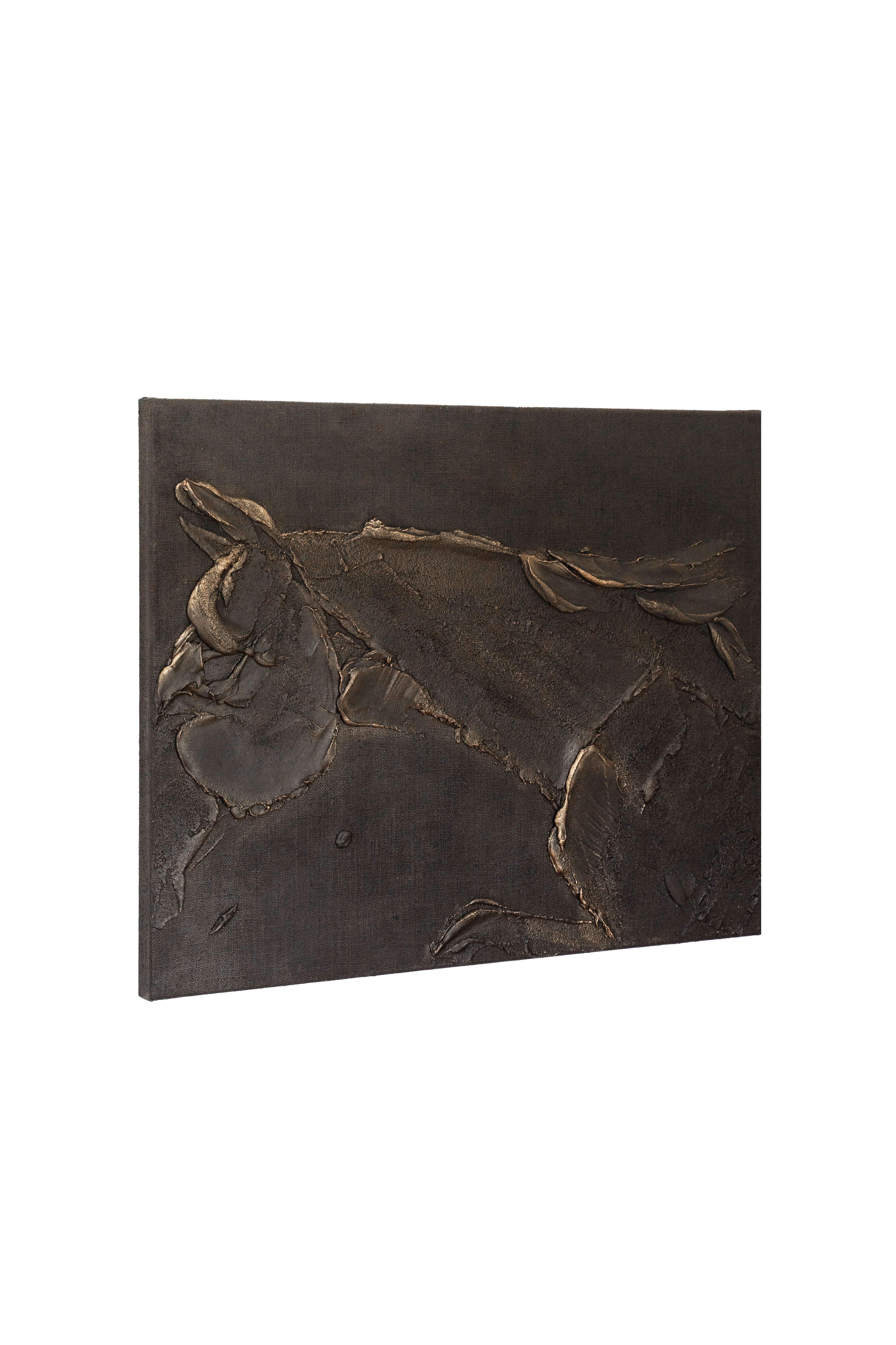“Birthright” is part of the “Imprint” collection, capturing a horse jumping over a hurdle with effortless grace, neck arched and mane flowing. Created using bas relief technique with sand, clay, jute, pigments and wood, this 74cm x 92cm x 3.7cm piece is rendered in black with gold highlights, revealing the horse’s innate power. This dimensional work expresses the horse’s natural inheritance—that extraordinary movement and power is their birthright.