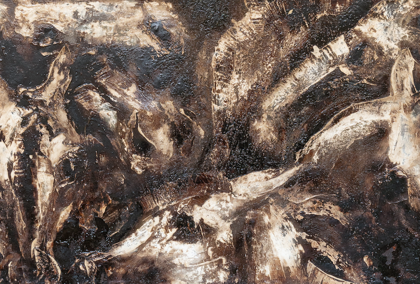 Curro is inspired by the horsemanship traditions of Galicia, Spain. Once a year, wild horses are gathered into round structures called curros to receive medical treatment before being released in the wild again. The experimental technique developed for this series of artworks explores the tension between organic and inorganic materials. Through a process of layering, the final figuration emerges. A creative process that takes joy in the unpredictability of the final result.