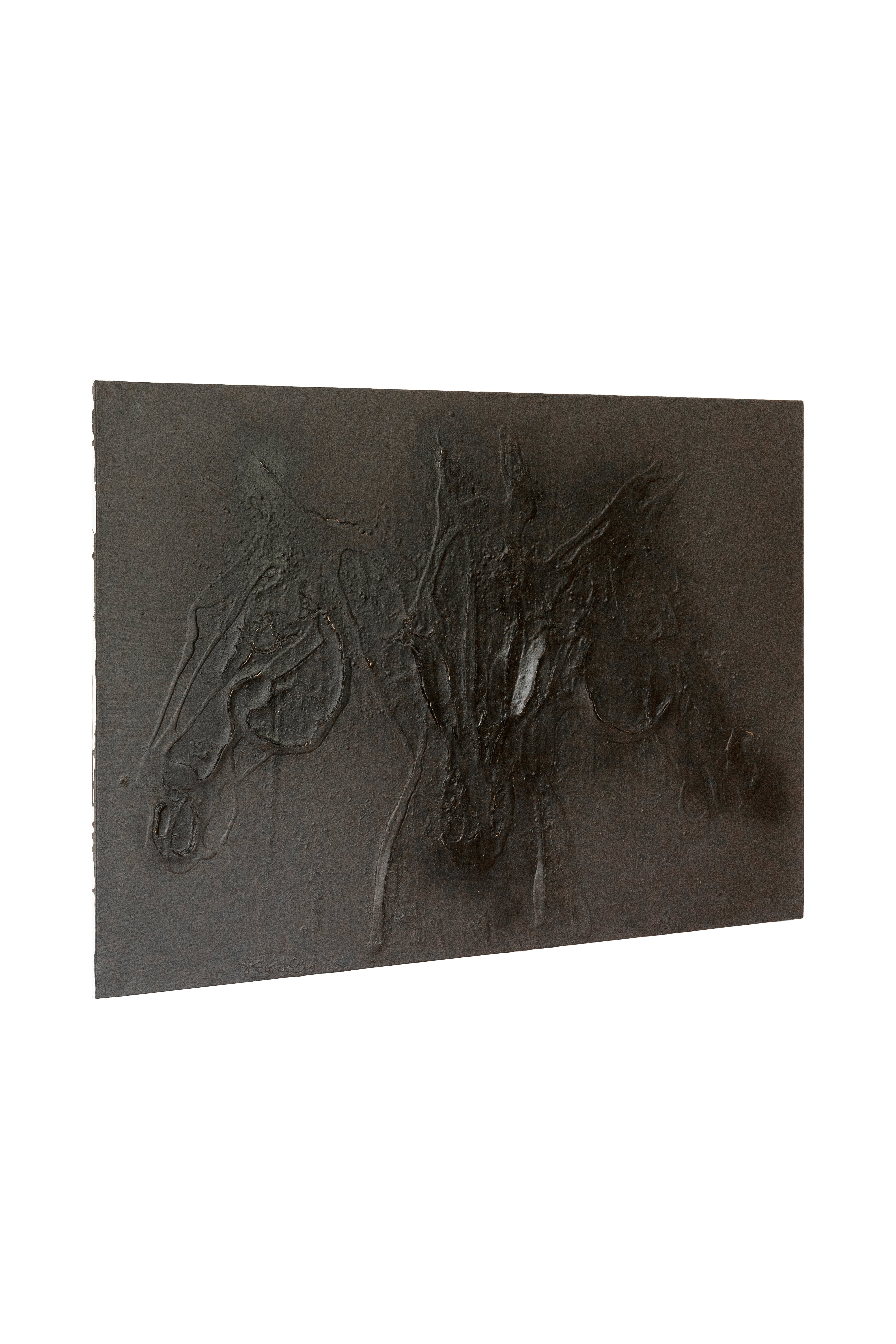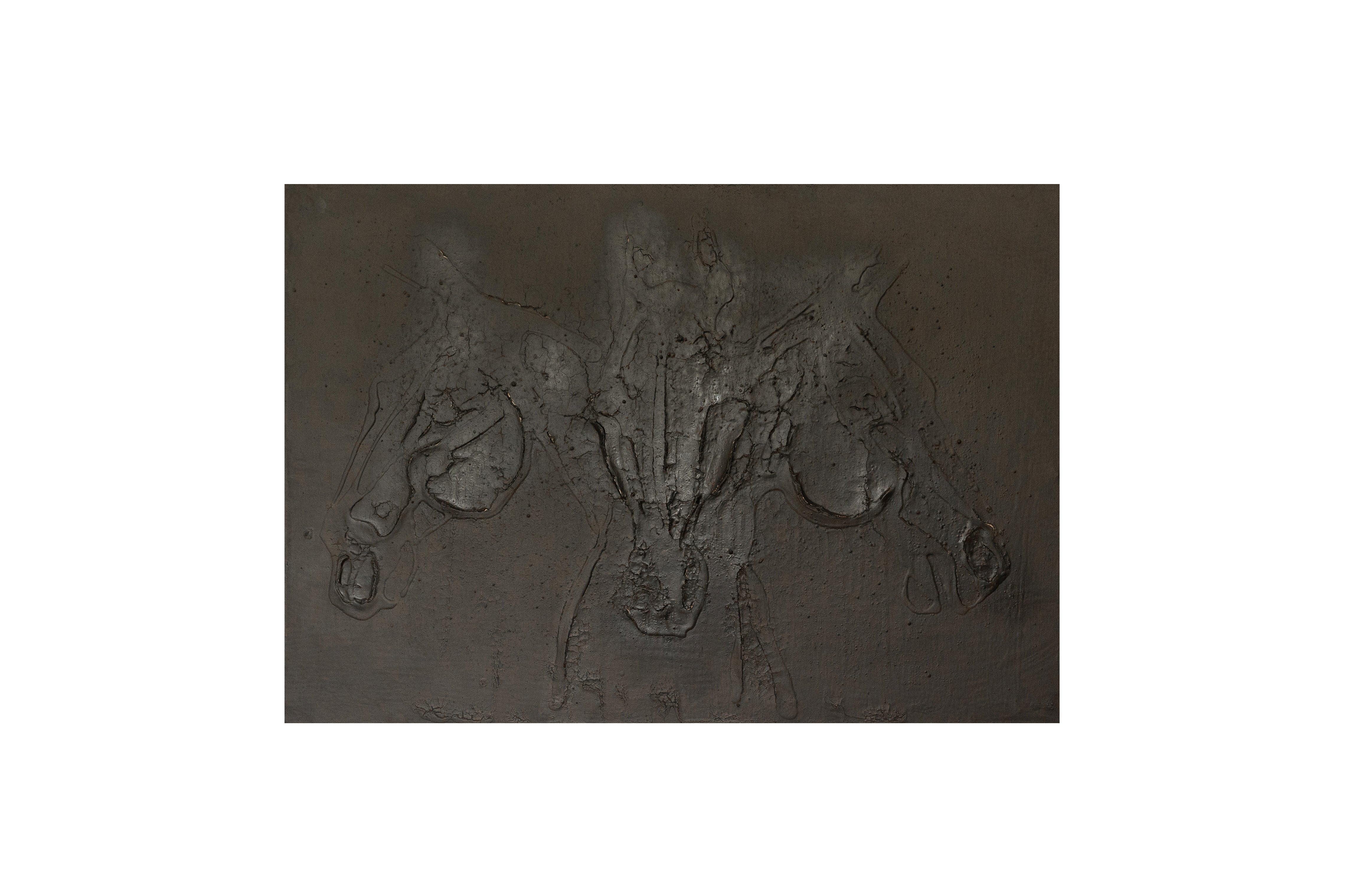 “Fissure” is part of the “Imprint” collection, capturing a three-sided horse rendered in dark grey and black, its form cracked all over with details emerging subtly through the fractured surface. Created with canvas, latex, paint, and coffee, this 89cm x 116cm x 2cm piece explores dimensionality through the interplay of surface and depth, where latex hiding underneath reveals itself through the network of cracks. The work creates a striking dialogue between concealment and revelation as the horse’s essence surfaces through the fissures with quiet persistence. This dimensional piece expresses the beauty found in brokenness, where fractures become pathways for hidden truths to emerge.