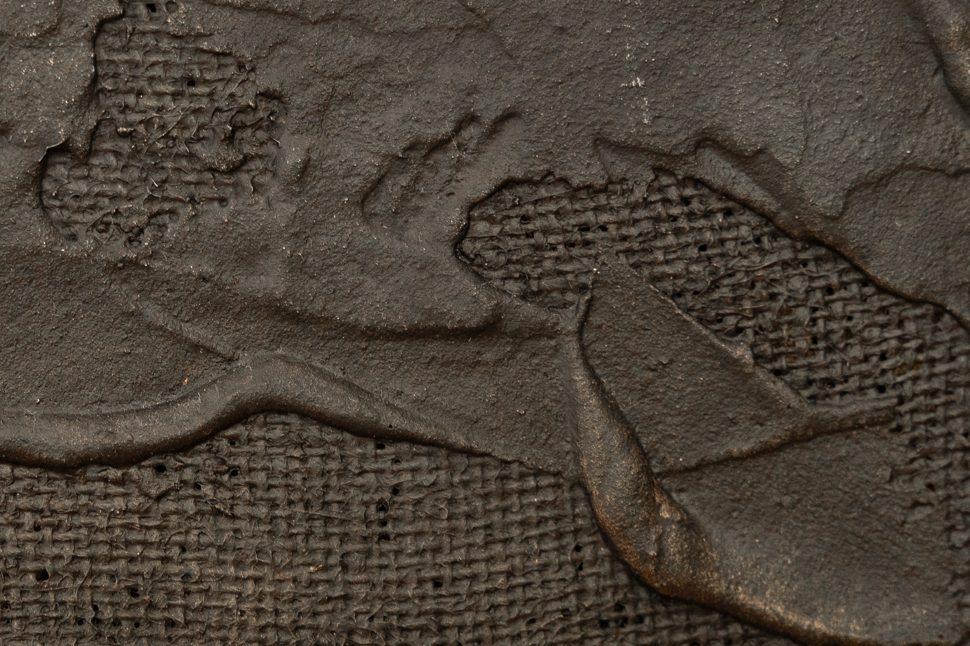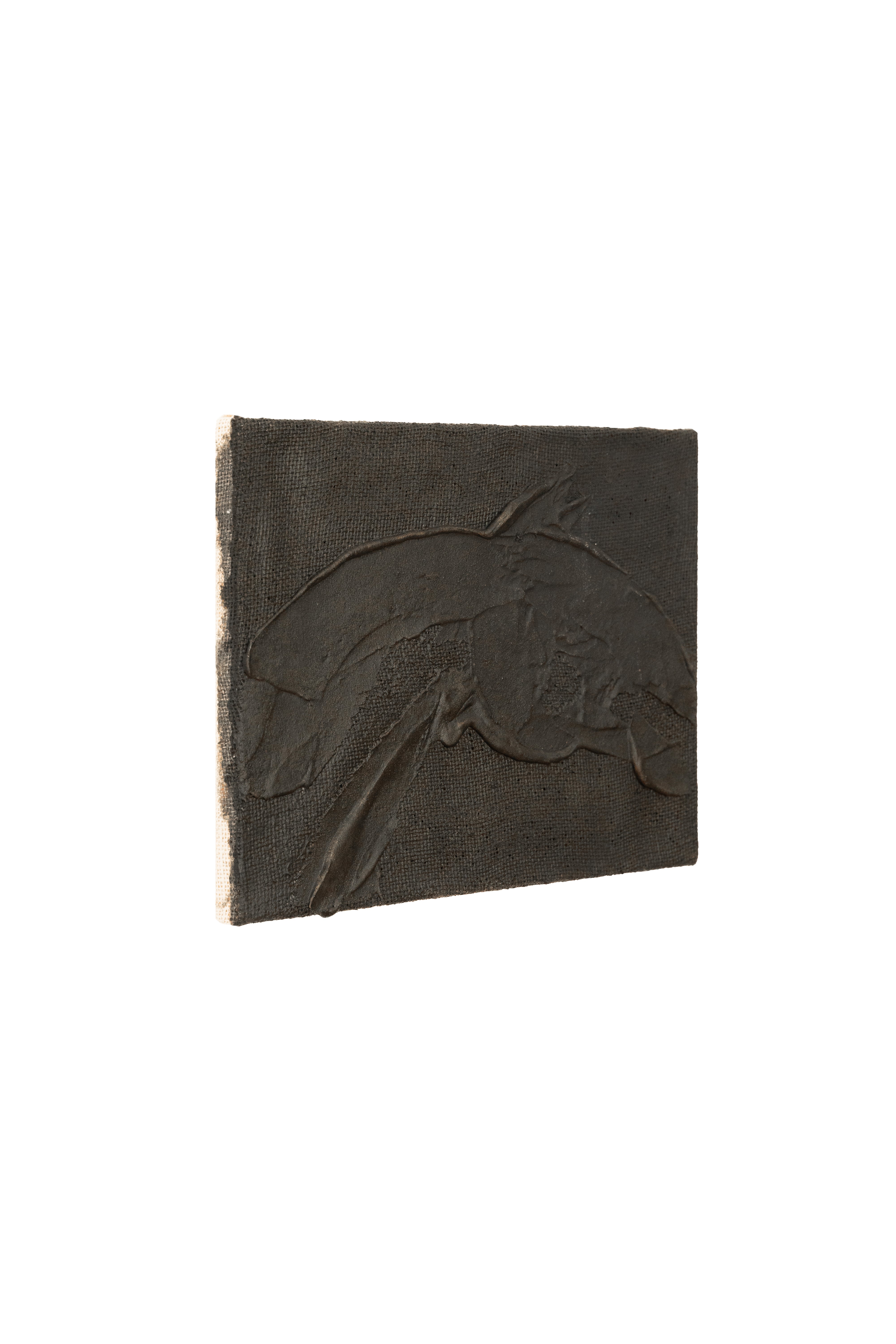 “Intent” is part of the “Imprint” collection, capturing a Spanish horse looking with purposeful attention and pricked ears out of the frame, its curved neck flowing gracefully to match its long fringe. Created using bas relief technique with humble earth materials—sand, clay, jute, pigments and wood—this 22cm x 25cm x 2cm piece holds the gesture of my hand while preserving this moment of focused alertness. Rendered in black with gold paint lightly brushed on, the work strips away all distraction to reveal the elegant form of this Andalusian beauty, embodying the totality of color enhanced by touches of luminous gold. This dimensional piece transforms a witnessed moment of equine intention into a tangible imprint of the horse’s characteristic grace and focused awareness.